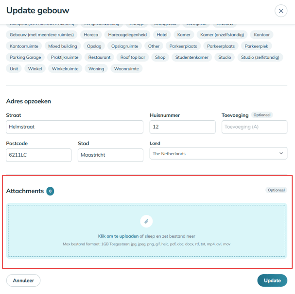 Beheerders kunnen algemene bestanden uploaden op zowel gebouw- als unitniveau. Deze bestanden zijn vervolgens zichtbaar voor de betreffende huurders onder het tabje 'Mijn Documenten' Dit maakt het eenvoudig om belangrijke documenten te delen
