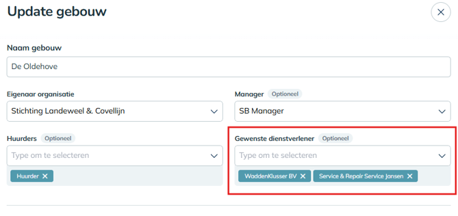 Wanneer je een dienstverlener toevoegt als gewenste dienstverlener aan een gebouw: