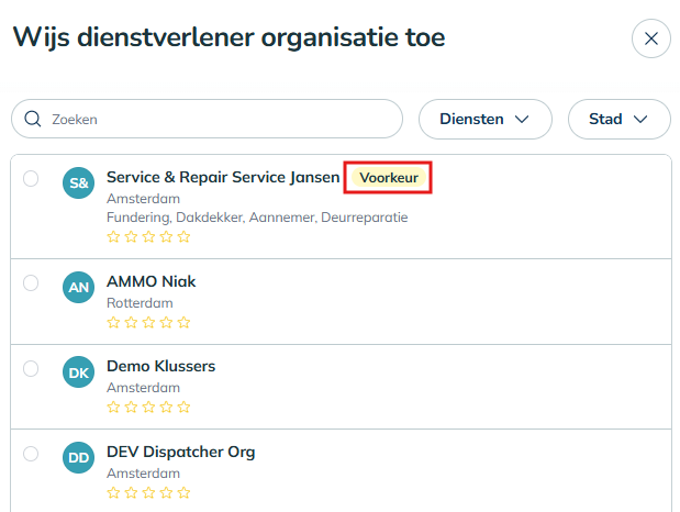De gekoppelde dienstverleners worden met een geel voorkeur logo bovenaan geplaats tijdens het selecteren van een dienstverlener in de taak: