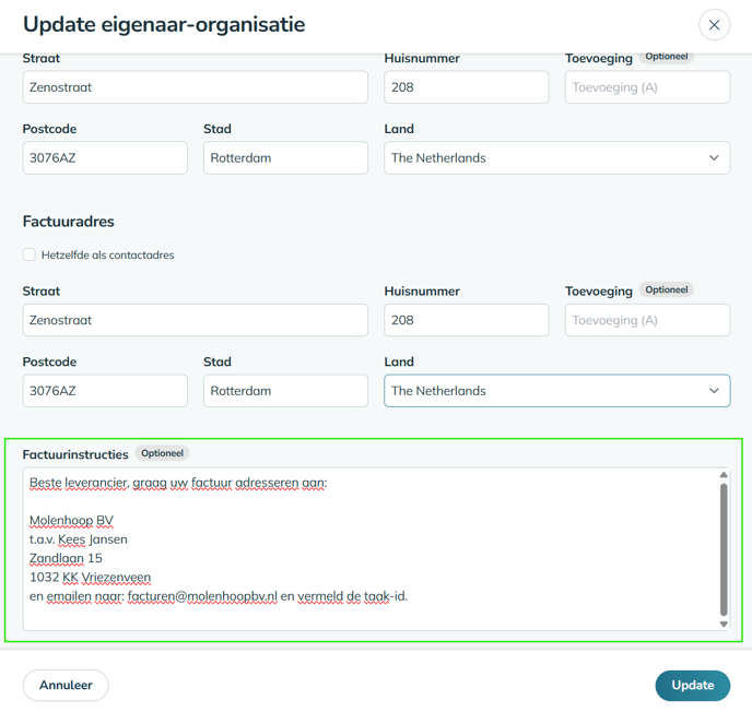 Organisaties > [Selecteer Eigenaar] > Bewerken > Factuurinstructies