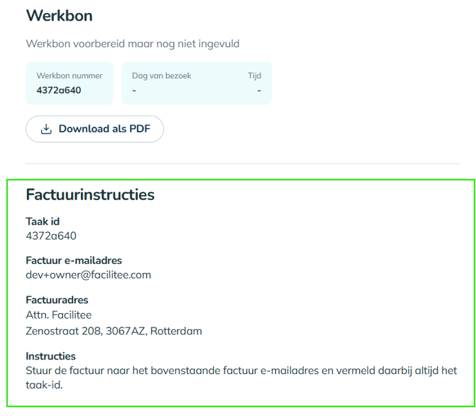 Nadat de dienstverlener de taak heeft geaccepteerd ziet hij deze op onderstaande wijze terug in de taak en deze worden ook onderaan de .PDF werkbon geprint: