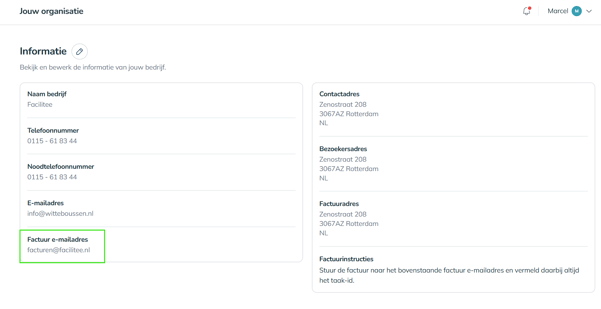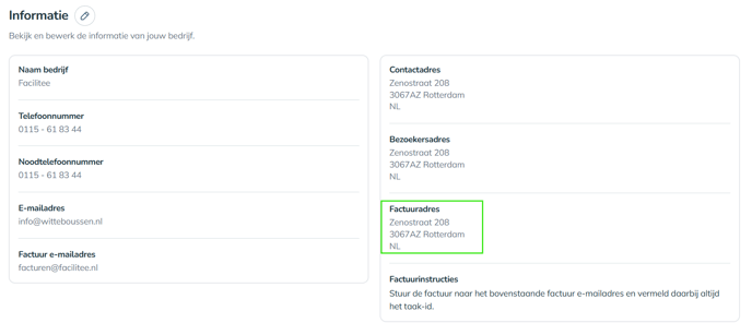 Het systeem gebruikt het opgegeven factuur e-mailadres om facturen automatisch te versturen. Het is van essentieel belang dat dit adres correct staat ingevuld. Als dit mailadres niet staat ingevuld, wordt er geen adres meegegeven in factuurinstructie richting de dienstverlener.