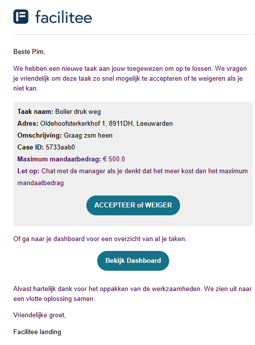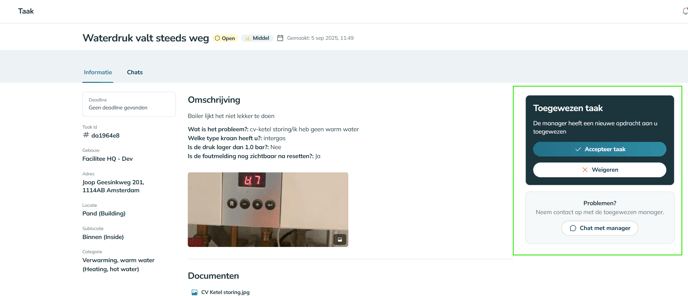 Klik op Accepteren als je de taak uitvoert of op Weigeren als je de taak niet kunt aannemen.