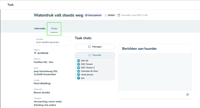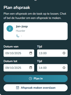Zodra je accepteert, kun je direct aan de slag met het inplannen van de taak door contact op te nemen met de huurder via de chat (of telefoon).