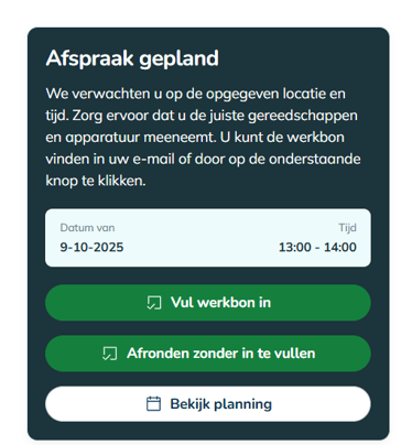 Nadat de taak is opgelost rond je ook de taak af in Facilitee d.m.v het invullen van de Facilitee werkbon of de knop 'Afronden zonder in te vullen' als je liever je eigen werkbon blijft gebruiken.
