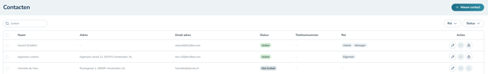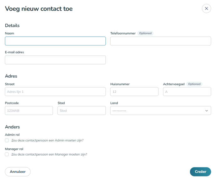 Vul alle verplichte velden in. Onderaan kun je aangeven of om een Admin of Manager gaat. Indien je hier geen rol invult zal het systeem naderhand bepalen welke rol (Huurder, eigenaar of dienstverlener) het contact dient te krijgen.