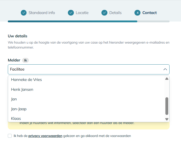 Selecteer de huurder/bewoner als Melder in de dropdown.