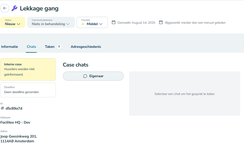 Tip: Gebruik interne cases bijvoorbeeld voor onderhoudsvoorbereiding, inspecties of interne opvolging, waarbij geen directe communicatie met de huurder nodig is.