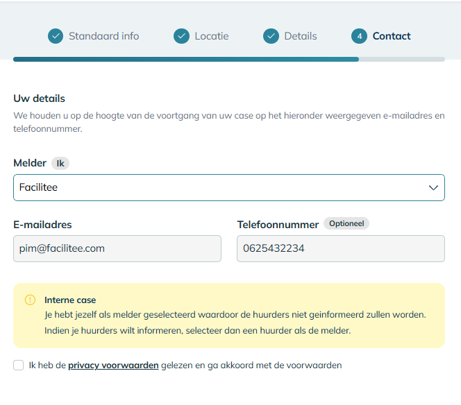 Het is niet mogelijk om van een interne case weer een normale case te maken. Zorg er dus voor dat je vooraf bedenkt of de huurder wel of niet betrokken moet worden, omdat dit naderhand niet aan te passen is.